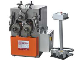 Section modulus cm 3,5 Diameter of shafts Upper Lower mm 40 Diameter of rolls mm 145 Power output kW 2,8 Rolling speed m min 5,5 Weight kg Machines compliant to 2006 42 CE standard 3 driving rolls to guarantee maximum drive on the profile Bending rolls independently adjustable, for double pre-bending capability on the leading and trailing end of symmetrical profiles Lateral guide rolls with three-dimensional adjustment Modular rolls that allow the bending of most profiles Standard bending rolls of alloy steel, heat treated to surface hardness 60 HRC Free standing remote control stat...